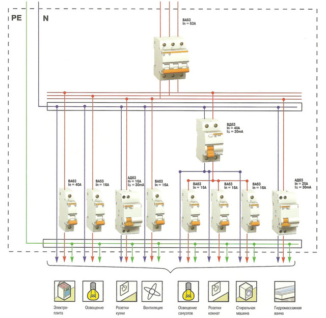 Увага! Нагадуємо, що дифавтомат ніколи не ставиться як вступний! Він використовується тільки для заміни загального протипожежного УЗО в схемі або пари лінійний автомат+ПЗВ.