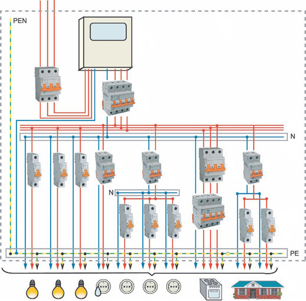 Увага! Для безпечної експлуатації проводки в таких схемах поділяють нульовий робочий та захисний провідник в кабелі на PEN-шині, навіть при відсутності заземлюючого контуру.