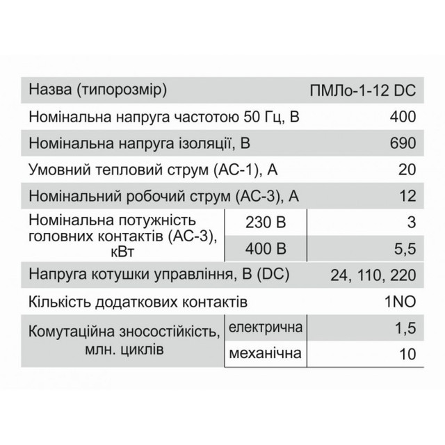 Контактор постійного струму ПМЛо-1-12, тип DC, 12А, котушка 220В, AC3, 1NO, Electro