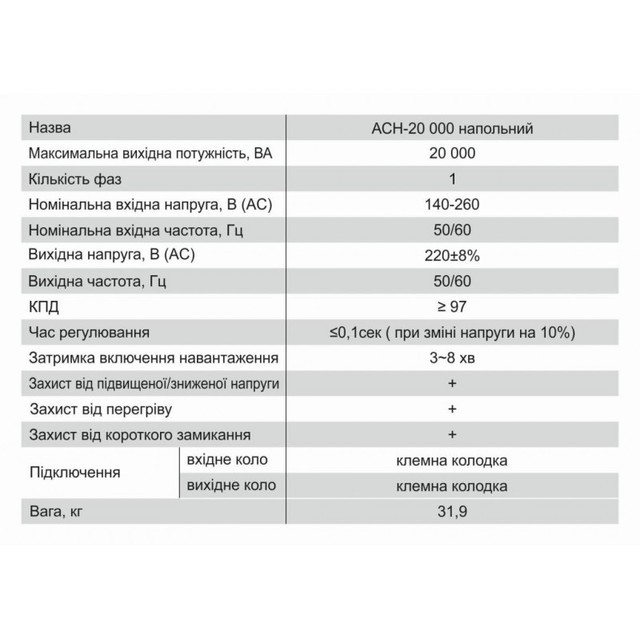 - Робочий діапазон вхідної напруги, В: 140÷260