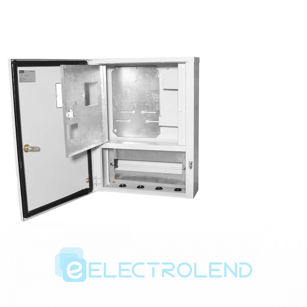 Габаритні розміри мм (шир. х вис. х глибину): 400х530х140. Товщина корпусу: 1,0 мм. Дводверний, під 1ф або 3ф лічильник, вступної 3-х полюсний автомат, УЗО, автоматичні вимикачі до 16 груп, з віконцем у зовнішній дверцятах для зняття показань лічильника. На дні виконано чотири отвори з діаметром 26 мм під сальник діаметром 25 мм. Поставляється з комплектом універсального кріплення для кріплення на опори різних конфігурацій - 0,5 (товщина) х 20 (ширина) х 1300 (довжина). матеріал - 0,5 оц.. Навісна конструкція. Ступінь захисту: IP 54. Кліматичне виконання У2 - для макрокліматичного району з помірним кліматом. Під навісом або в приміщенні, де умови такі самі як на відкритому повітрі, за виключенням сонячної радіації. Покриття порошкове RAL: 7035.