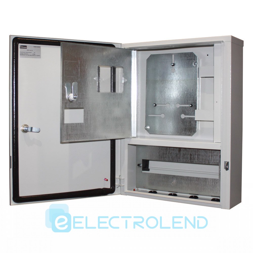 Дводверний, під 1ф або 3ф лічильник, вступної 3-х полюсний автомат, УЗО, автоматичні вимикачі до 16 груп, без вікна у зовнішніх дверцятах.