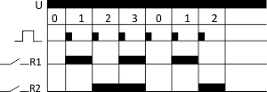 реле живлення відображається зеленим світлодіодом U. Послідовне реле має два окремих виходи: R1 і R2. Стан контакту (розімкнутий / замкнутий) примусово встановлюється послідовно у відповідності з наперед заданою програмою. Стан контакту перемикається наступним імпульсом керуючого ключа. Перемикання контактів R1 і R2 відображається відповідними червоними світлодіодами R1 і R2. У разі збою живлення стан контакту скидається. Коли напруга живлення повертається, реле запускається з порядковим номером 0.