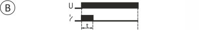 Після подачі напруги живлення (горить зелений світлодіод U) вихід залишається розімкненим і вимірюється встановлений час спрацьовування «t». Після виміру часу «t» вихід включається (горить червоний світлодіод). Повторне виконання режиму роботи реле можливо після відключення напруги живлення та його повторного включення.