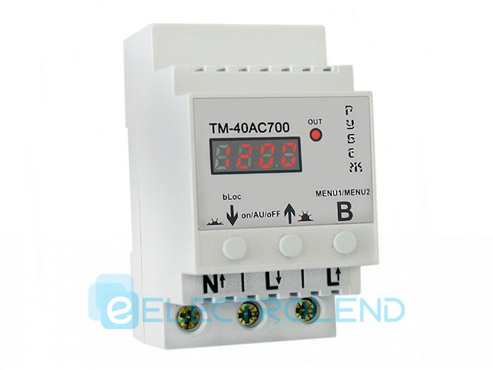 ТМ-40АС700 надалі прилад, призначений для включення і відключення навантаження по заданому часу доби, а також по астрономічному часу (схід / захід сонця), на основі введених координат (тільки для України) і поточного часу, дозволяючи керувати освітленням без використання зовнішніх датчиків . Точність установки часу в програмах 1 секунда. Тимчасові осередки і астрономічні можуть комбінуватися в будь-який з нижчеперелічених програм. Прилад має програми: добова, тижнева, два вихідних дня, один вихідний день, які дозволяють встановити від 99 до 693 тимчасових або астрономічних осередків включення і виключення в добу, в залежності від обраної програми. Передбачена настройка астрономічних осередків, що дозволяє відключати навантаження вночі (нічна перерва). Вбудований календар до 2099 року. Автоматичний перехід на літній / зимовий час з можливістю відключення цієї функції. Прилад має вбудований годинник з запасом ходу до 10 років (вбудований живить елемент BAT CR 2032-3V). При потребі можна відкоригувати точність ходу внутрішнього годинника. Також прилад не вимагає повторних налаштувань в разі відключення електроенергії, всі налаштування зберігаються в незалежній пам'яті. Прилад має три варіанти роботи контактів реле: on - завжди включено, AU - робота по заданих налаштувань, oFF - завжди вимкнено. Є функція видалення всіх тимчасових осередків, і кожної окремо. Передбачена електронне блокування кнопок управління.