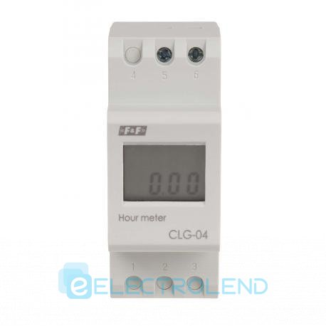 Лічильник CLG-04 - це односторонній електролічильник з електронним лічильником, що дозволяє рахувати робочі години в діапазоні від 0 до 999999,99 (6 годинних цифр + 2 хвилинні цифри після десяткової коми). Після досягнення максимального результату лічильник починає відлік від 0. Час підраховується, коли до клем 5-6 підключена напруга 100 ÷ 240 В змінного / постійного струму.