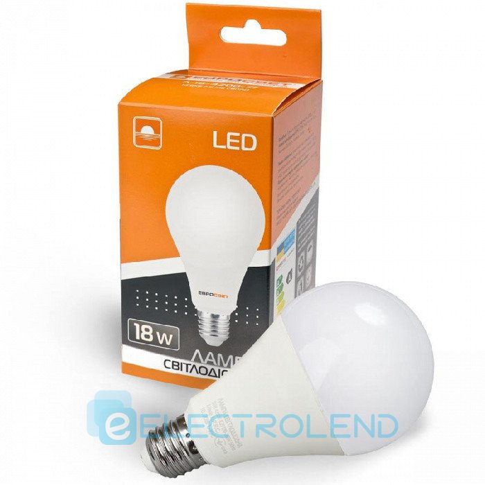 Лампа світлодіодна ЕВРОСВЕТ 18Вт 4200К A-18-4200-27 Е27 має класичну форму лампочки, проте її потужність становить 18 Вт, що робить її найпотужнішою світлодіодною лампою в лінійці наших товарів. Стандартний цоколь дозволяє приєднати її до більшості світильників і люстр. Світловий потік — 1500 люмен, для розуміння, це як стара лампочка розжарювання 125 Вт.