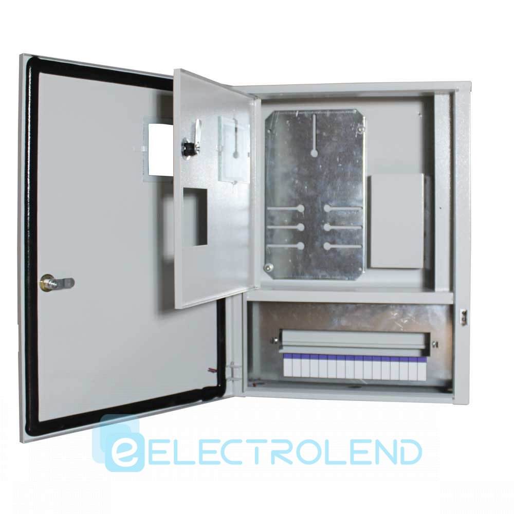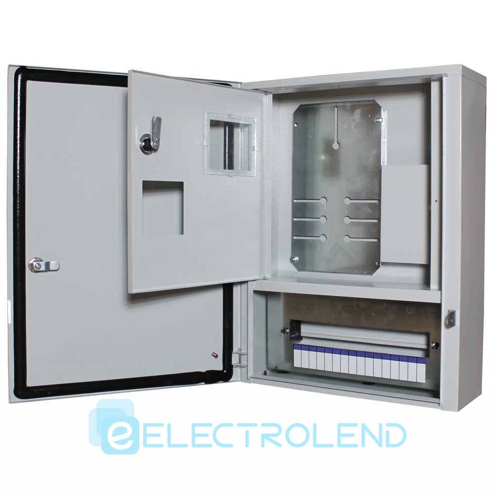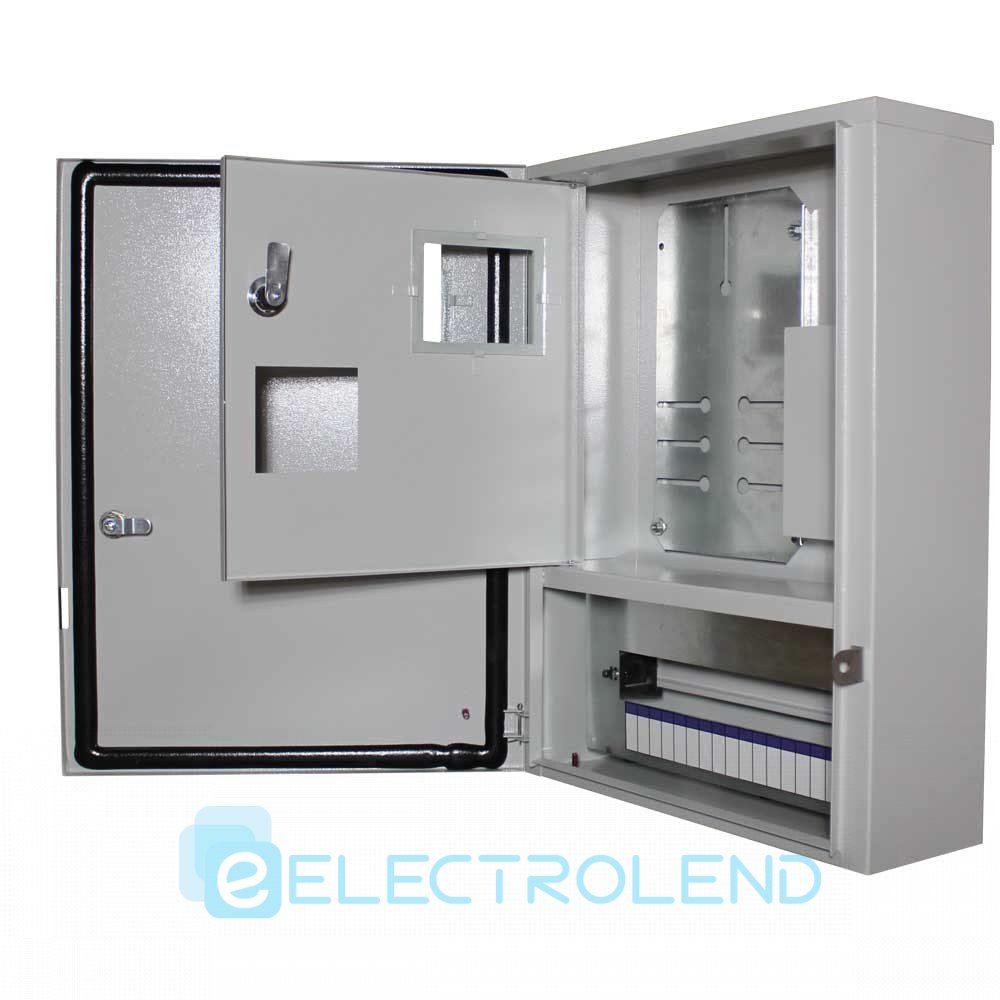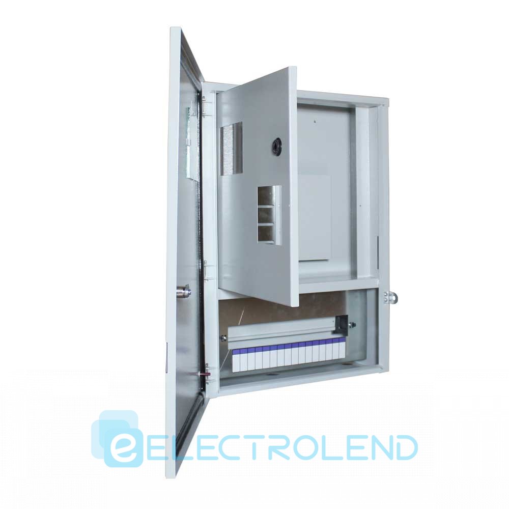 Двудверний, під 1ф або 3ф лічильника, ввідний автомат ВА, автоматичні вимикачі до 16 груп, з вікном на зовнішніх дверцятах для зняття показів лічильника.