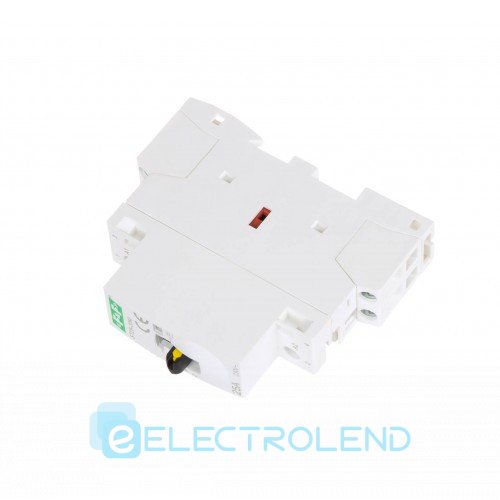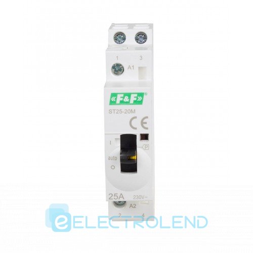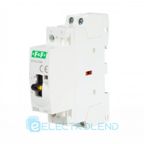 Модульний електромагнітний контактор для монтажу на DIN-рейку в розподільному щитку. Перемикач на передній панелі дозволяє вручну управляти контактами контактора (незалежно від стану котушки). Це дозволяє підключати або від’єднувати навантаження вручну, наприклад, під час монтажу/обслуговування.