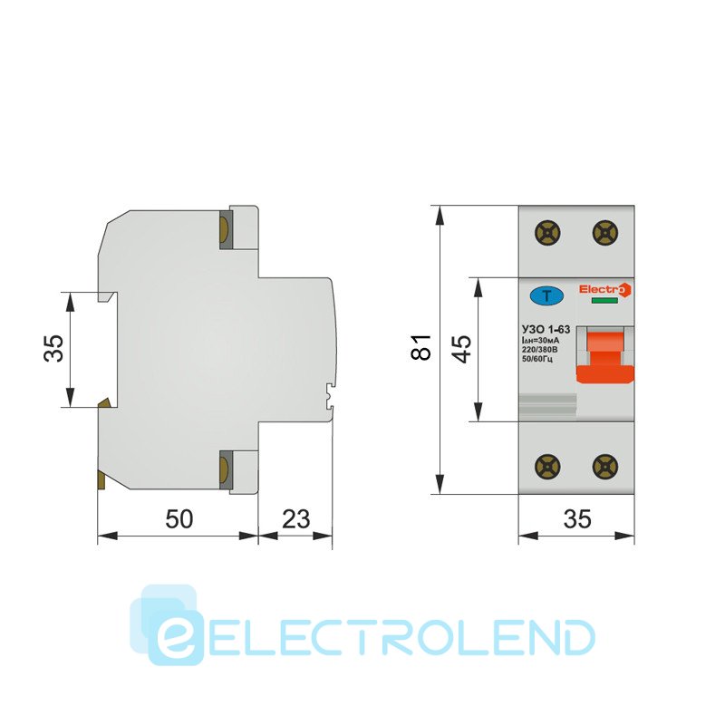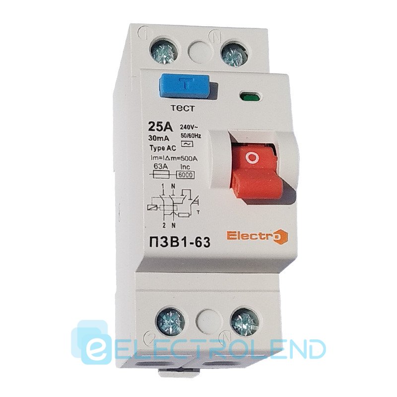 Пристрій захисного відключення ПЗВ1-63, 2P, 25А, 30мА, 6kА, тип АС, Electro