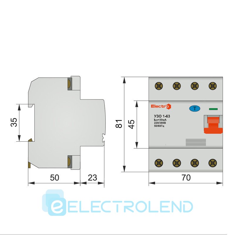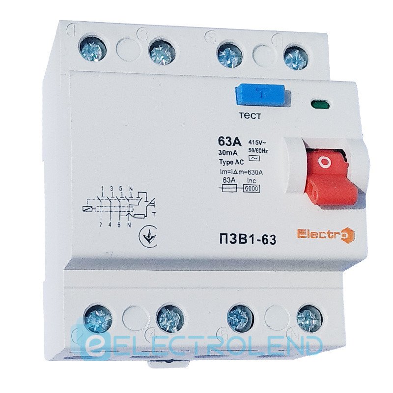 Пристрій захисного відключення ПЗВ1-63, 4P, 63А, 30мА, 6kА, тип АС, Electro