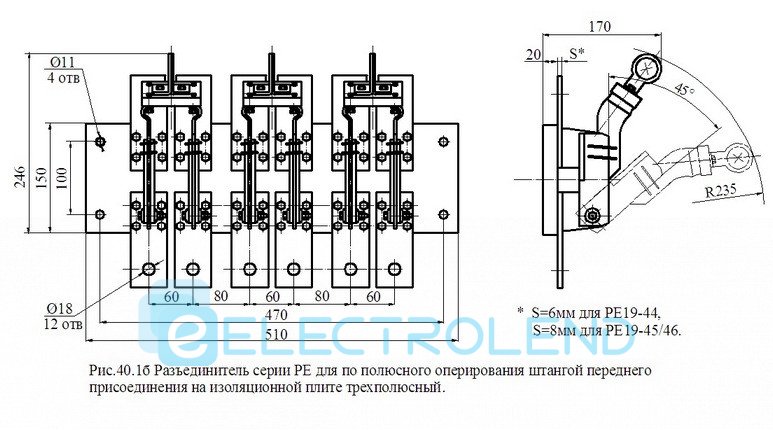 1,2,3-полюсний переднього приєднання з важелем для пополюсного оперування штангою на ізоляційній плиті (ІП)