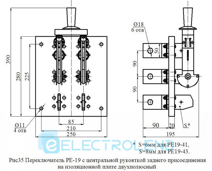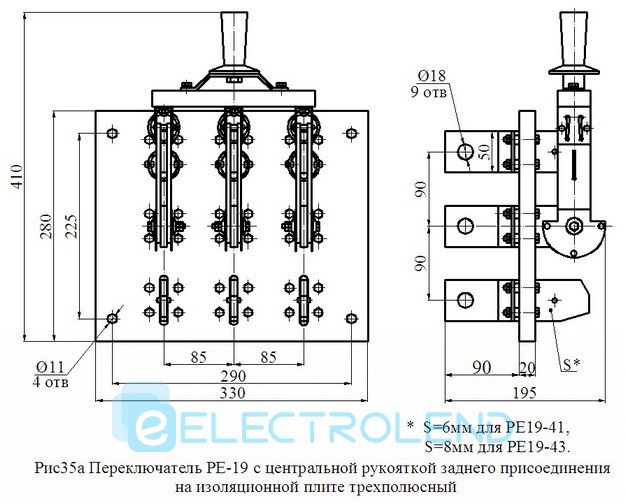 Широкий вибір виконань роз'єднувачів РЕ19 : по номінальному струму, виду ручного приводу, кількості полюсів, розташуванню контактних виведень. Виготовлятися роз'єднувачі можуть на ізоляційних секціях або на ізоляційній плиті. |