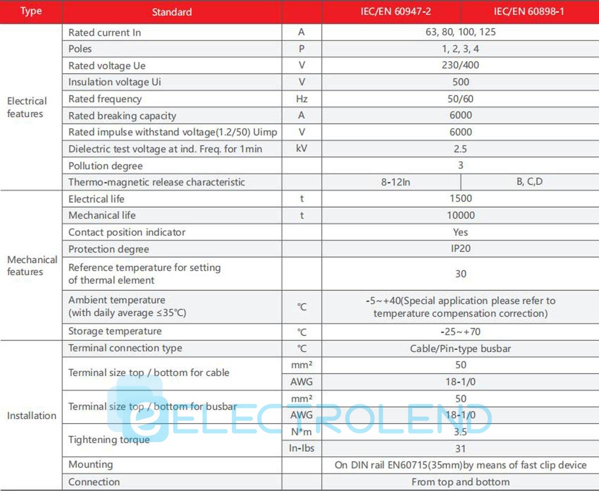 Модульний автоматичний вимикач YCB1-125, 1Р 125А, C, 6кА, CNC