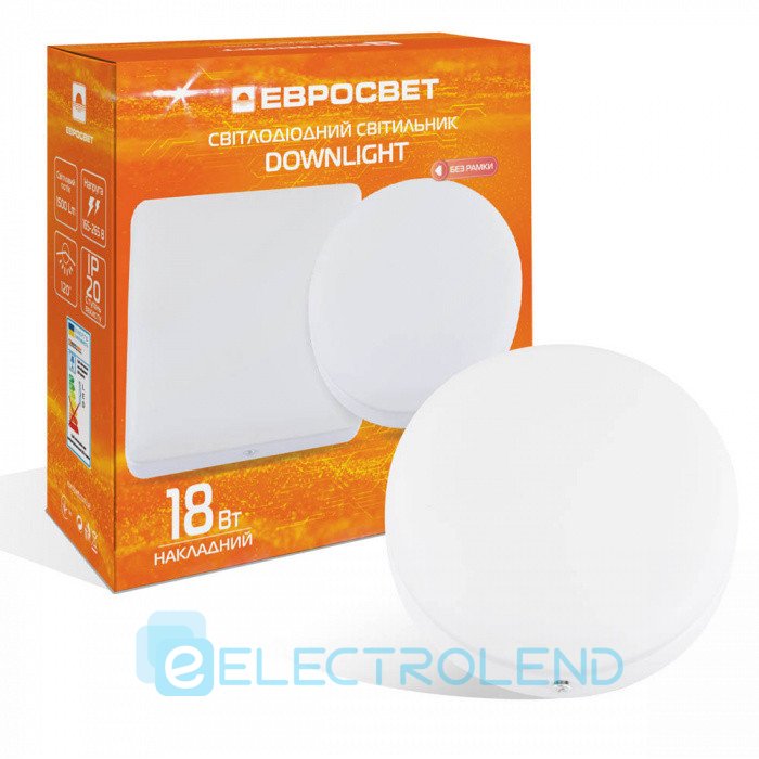 Світлодіодний світильник точковий накладний ЕВРОСВЕТ 18Вт коло LED-SR-120-18 6400К без рамки обирають для освітлення коридорів і приміщень без натяжної стелі. Скоба в комплекті дозволяє зручно розташувати даунлайт на будь-якій рівній поверхні.