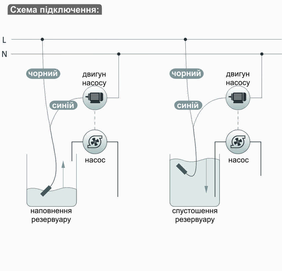 До зонда під'єднано 3-жильний кабель (кольори: чорний, коричневий, синій). Підняття щупа під кутом +45 градусів (або вище) замикає контакт між чорним і коричневим проводами. Опускання щупа під кутом -45 градусів (або нижче) замкне контакт між чорним і синім проводами.
