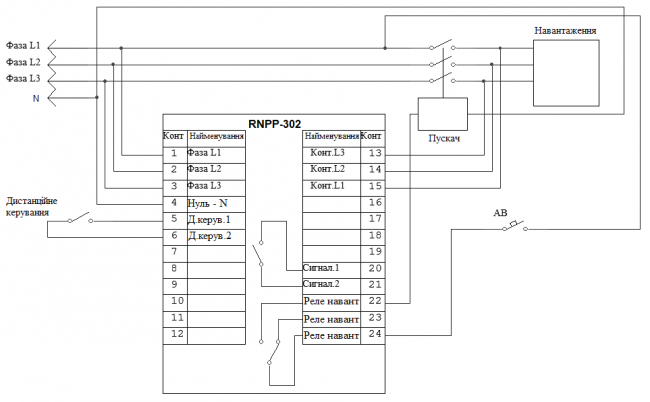 RNPP-302 вимірює діючі значення фазних (лінійних) напруг, у мережах із глухозаземленою або ізольованою нейтраллю і керує котушкою зовнішнього магнітного пускача, що комутує ланцюг живлення навантаження.