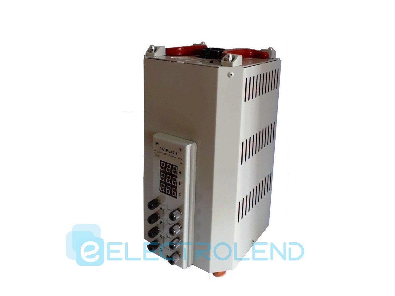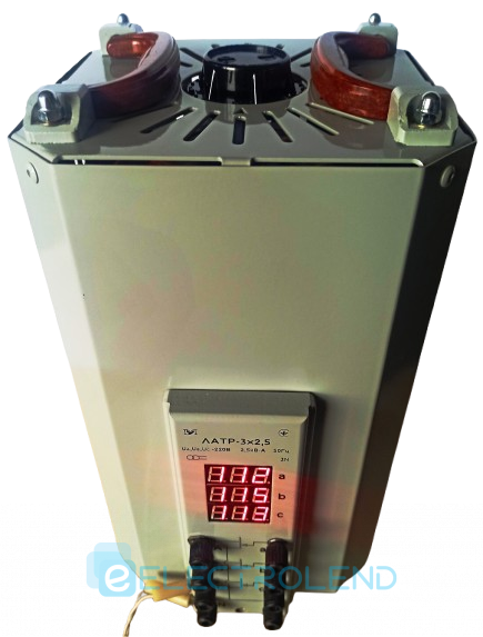 Лабораторний автотрансформатор трифазний типу ЛАТР-3х2,5, з цифровою індикацією вихідної фазної напруги, призначений для плавного регулювання напруги без розриву ланцюга у трифазній мережі 380 В частотою 50 (60) Гц при виконанні електротехнічних робіт.