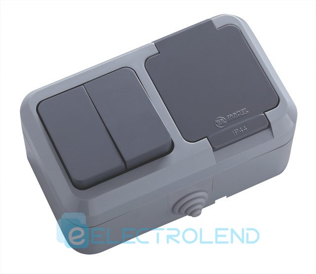 Вимикач 2-клавішний+розетка з кришкою IP44 сірий 18151 Makel