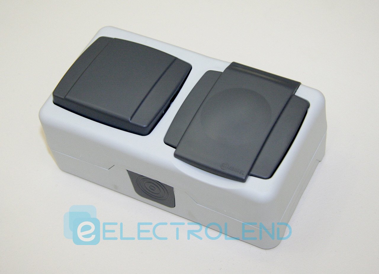 Вимикач 1-клавішний+розетка з кришкою IP44 сірий 37064202 Makel