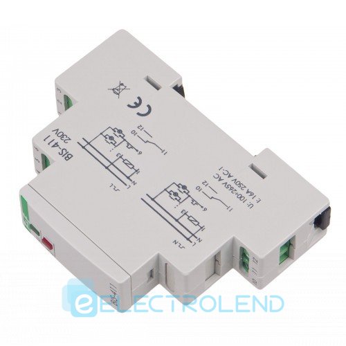 - BIS-411M 230 V – з пам’яттю стану контактів. Після пропадання напруги живлення реле, та повторній появі напруги живлення, контакти реле повернуться до положення в якому вони були до пропадання напруги живлення;