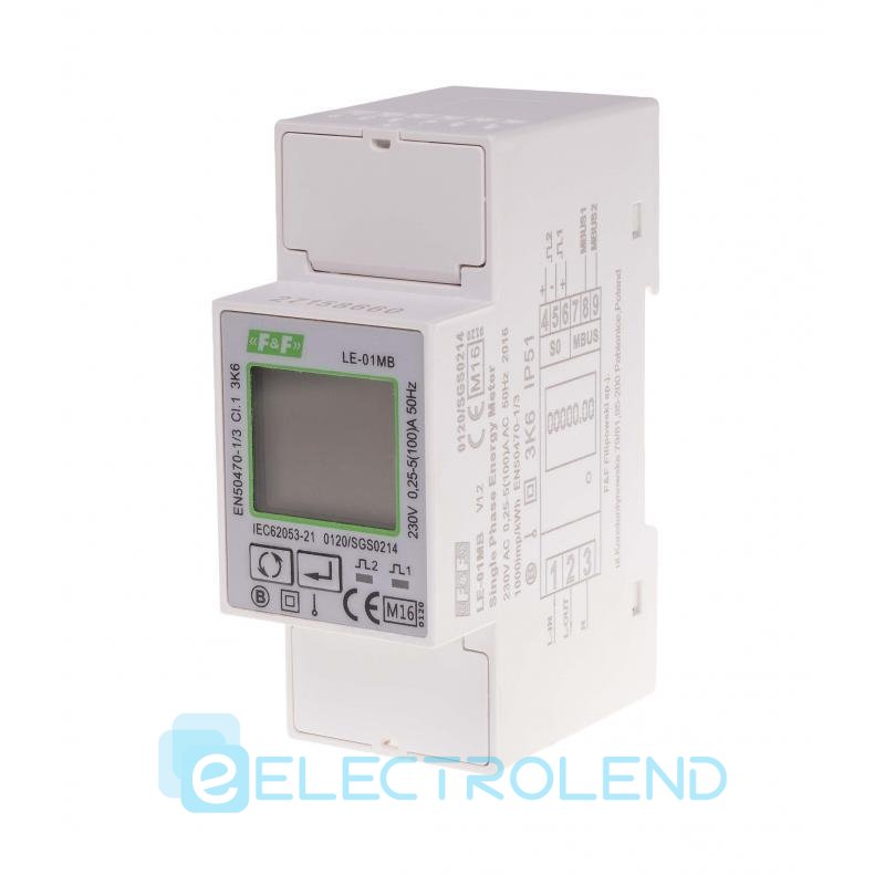 LE-01MB - це електронний лічильник електричної енергії змінного струму однофазній в системі. Служить для індикації і реєстрації, взятої електричної енергії, а також параметрів мережі з можливістю дистанційного зчитування показань через дротову мережу стандарту M-Bus. Налаштування лічильника відбувається через меню налаштувань, доступне з передньої панелі і через комунікаційний порт у відповідності з програмними функціями M-Bus.