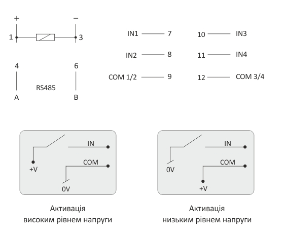 * вибір опції активації стану 1: високим або низьким рівнем напруги, замиканням або розмиканням електричних ланцюгів на входах