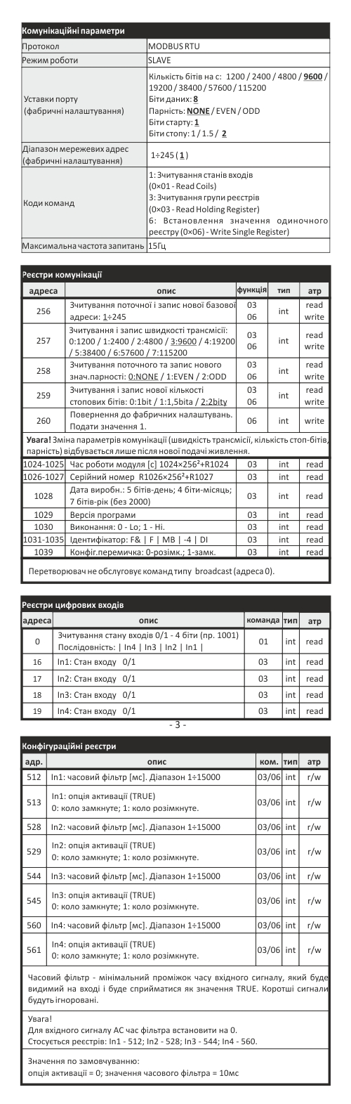Параметри комунікації | Швидкість - встановлюється 1200 ÷ 115200 bit / s Біти даних 8 Стоп-біти 1 / 1.5 / 2 Біти парності EVEN / ODD / NONE Адреса 1 ÷ 247 |