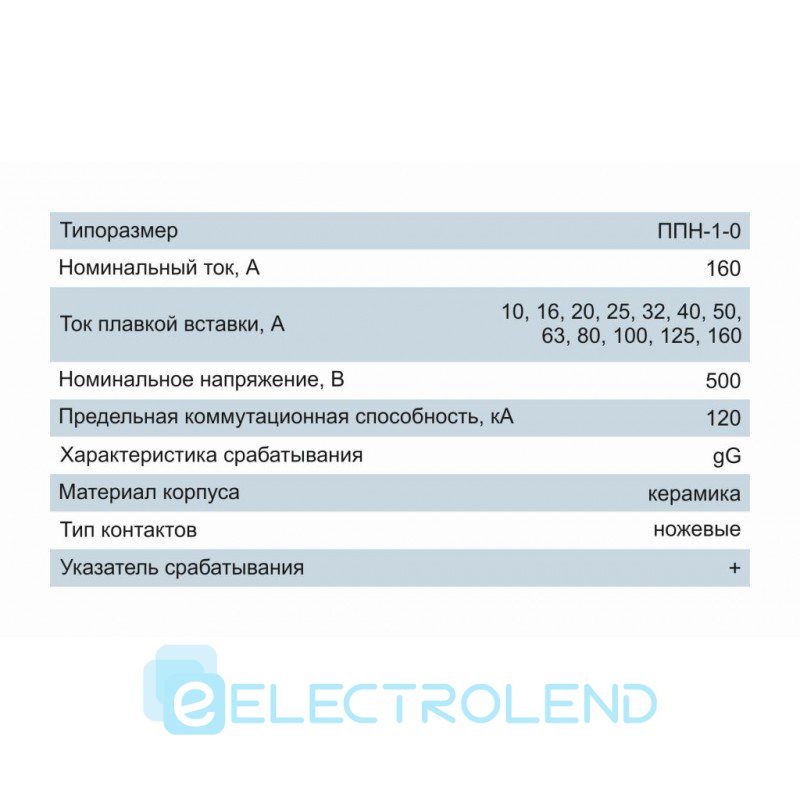Величина плавкої вставки, А | 10, 16, 20, 25, 32, 40, 50, 63, 80, 100, 125, 160 | |