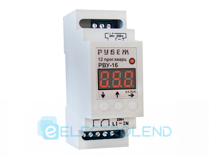 Реле времени РВУ-16 (в дальнейшем прибор), используется в системах автоматизации для включения или отключения нагрузки через заданное время, а также может работать в циклическом режиме неограниченное количество времени. Имеет 12 программ: 8 на включение/отключение, 4 циклические, 2 настраиваемых времени работапауза. Прибор может работать в секундах, минутах и часах. Запуск и остановка программ осуществляется с помощью управляющих контактов или с кнопки управления на панели прибора. Також прилад має додаткові функції: блокування кнопок управління, вимикання приладу з кнопки на приладовій панелі, регульоване час тривалості імпульсу, що подається на керуючі контакти, аварійна зупинка роботи програми, регульована кількість повторів (для циклічних режимів).