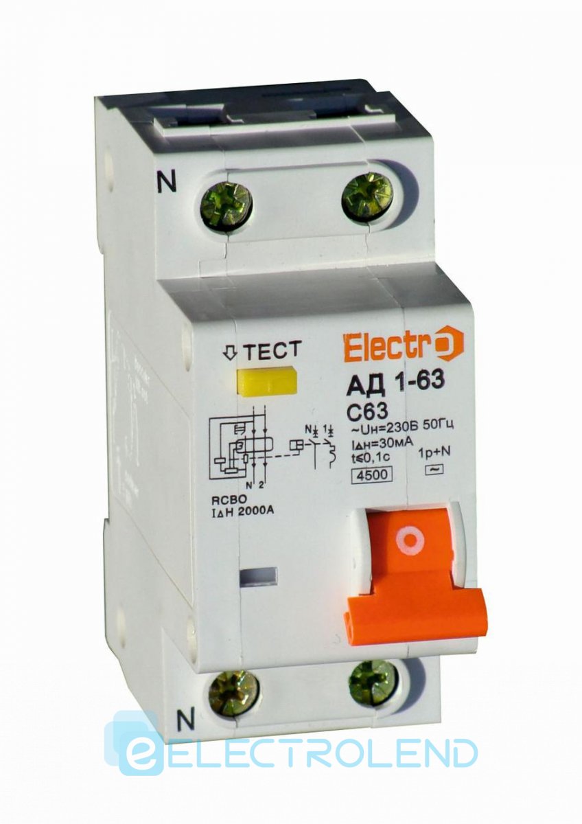Диференційний автоматичний вимикач АД1-63, 1P+N, 10A, 30мА, 4,5 ка, Electro