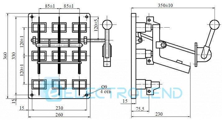 Рубильник ПЦ-6 630А з боковим зміщеним приводом на передню панель, без олова, мідні контакти