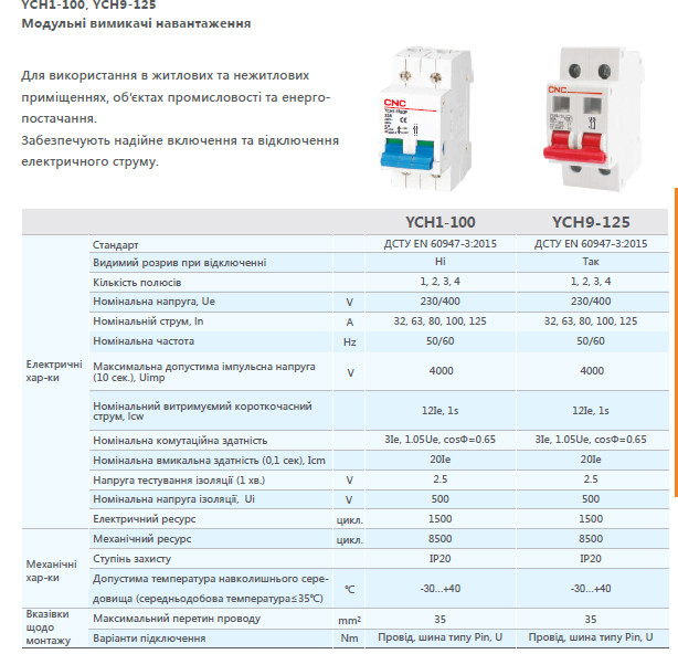 Модульний вимикач навантаження YCH1-125, 2Р, 100А, CNC