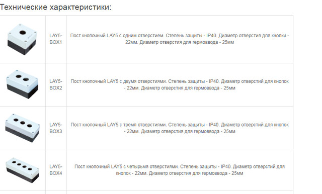 Корпуси кнопкових постів LAY5 призначені для комплектації кнопкових постів. Використовуються в побутових і промислових розподільних пристроях, пультах управління обладнанням і в системах автоматизації. Пости кнопкові LAY5 є сучасними пристроями керування технологічним обладнанням. Завдяки простоті і універсальності своєї конструкції, можливі безмежні варіанти модифікації кнопкових груп, комутаційних деталей, кнопок робочих органів, штовхачів відповідного призначення для потреб споживача.