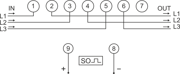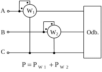Спеціальна електронна система під впливом протікаючого струму і прикладеної напруги в кожній фазі генерує імпульси в кількості, пропорційній споживаної електроенергії в цій фазі. Споживана потужність у фазах вказується миготінням світлодіодів A і C. Сума імпульсів від трьох фаз сигналізується миготінням світлодіода (800 імп / квтг), перетворюється в енергію, зібрану у всій трифазній системі, а його значення відображається на сегментному РК-дисплеї. Цифра після десяткової крапки означає десяткові частини (0,1 кВт · год = 100 вт / год).