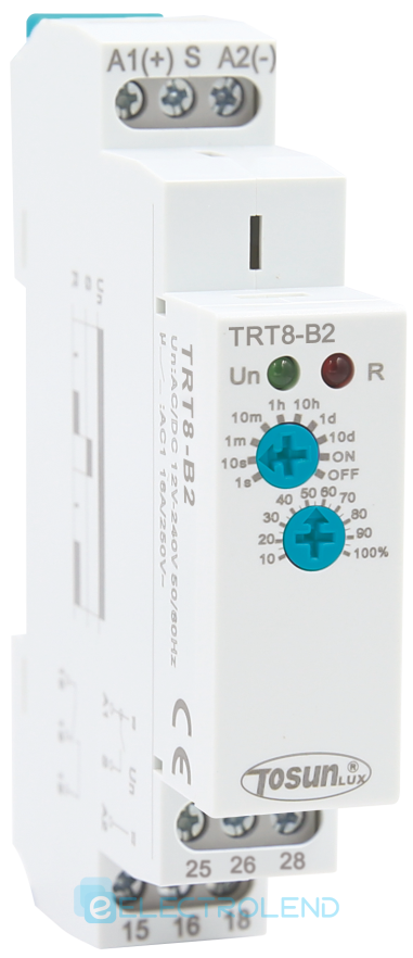 Реле затримки на вмикання TRT8-A1/A230 живлення AC 230B, діапазон 0,1 сек - 10 днів, вихід 1SPDT (перемикаючий контакт) 16A (AC1) TOSUNLux