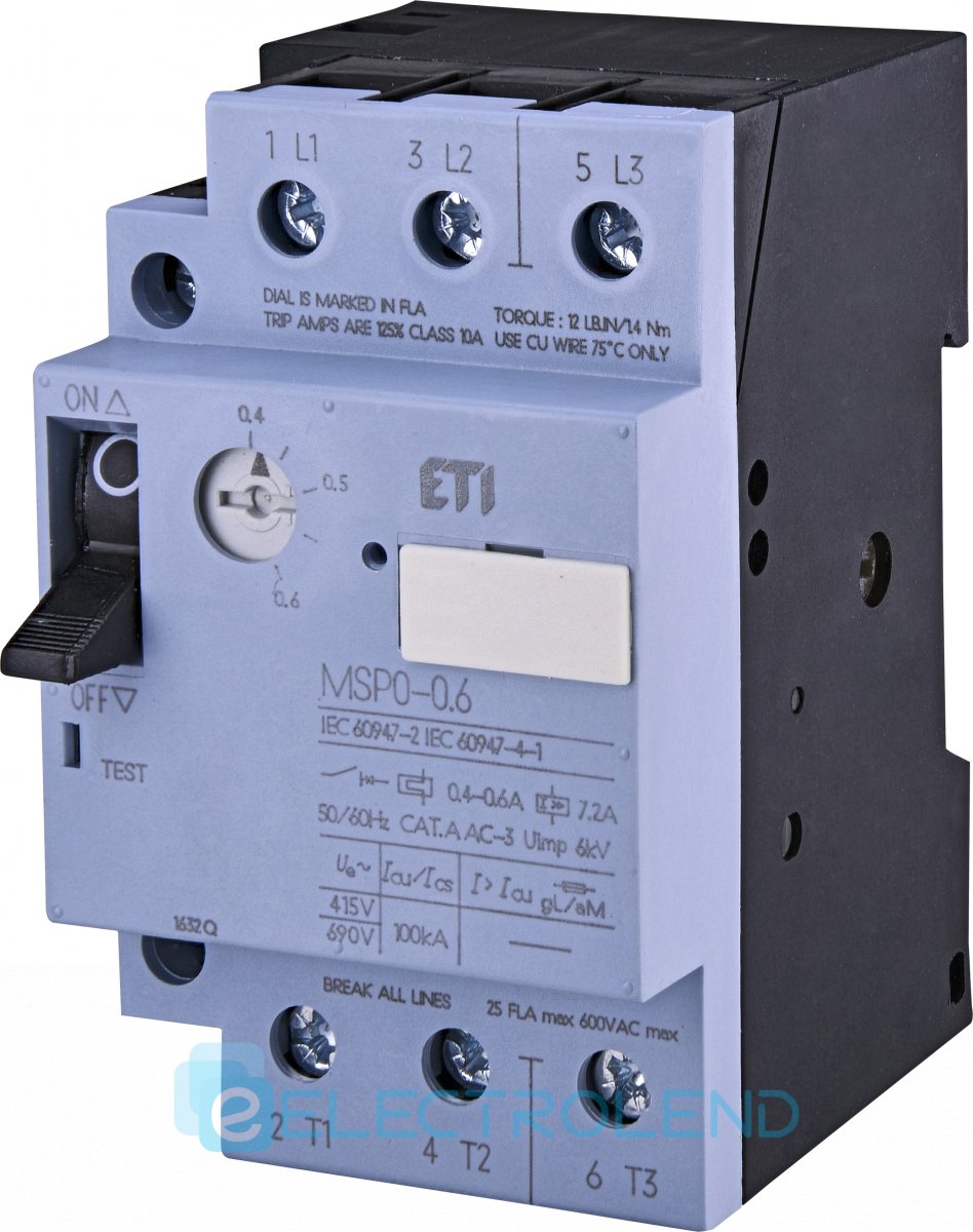 Автомат защиты двигателя MSP0-0,6 (0,12-0,18 кВт, 0,4-0,6 А) ETI 4646618