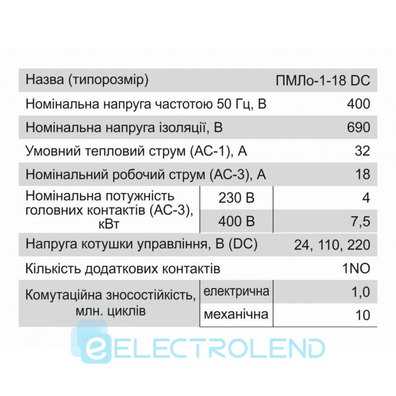 Контактор постоянного тока ПМЛоDC-1-18, тип DC, 18А, катушка 220В, AC3, 1NO, Electro