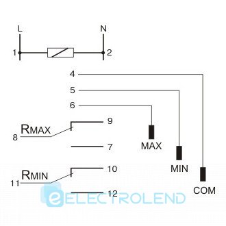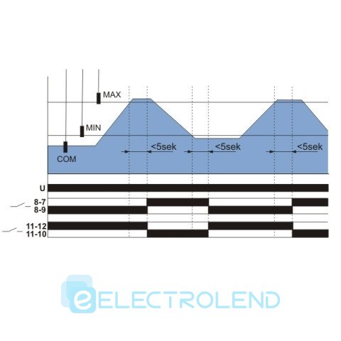 Действие: если уровень жидкости упадет ниже положения МИН (электроды МИН и ЗАГ разомкнуты) - замыкаются контакты выходного реле 11-12 и 8-9. Если уровень жидкости поднимется выше положения МАКС (замкнутся электроды МАКС и ЗАГ) - замыкаются контакты выходного реле 11-10 и 8-7. Реле PZ-829 RC B имеет дополнительно регулятор чувствительности на проводимость жидкости.