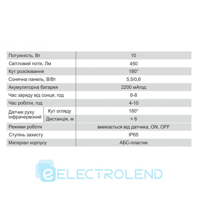 Светильник на солнечной бататарее TS 10Вт, IP65, 450Lm, 2200 mAh, датчик движения до 6-8m, угол 180, Electro