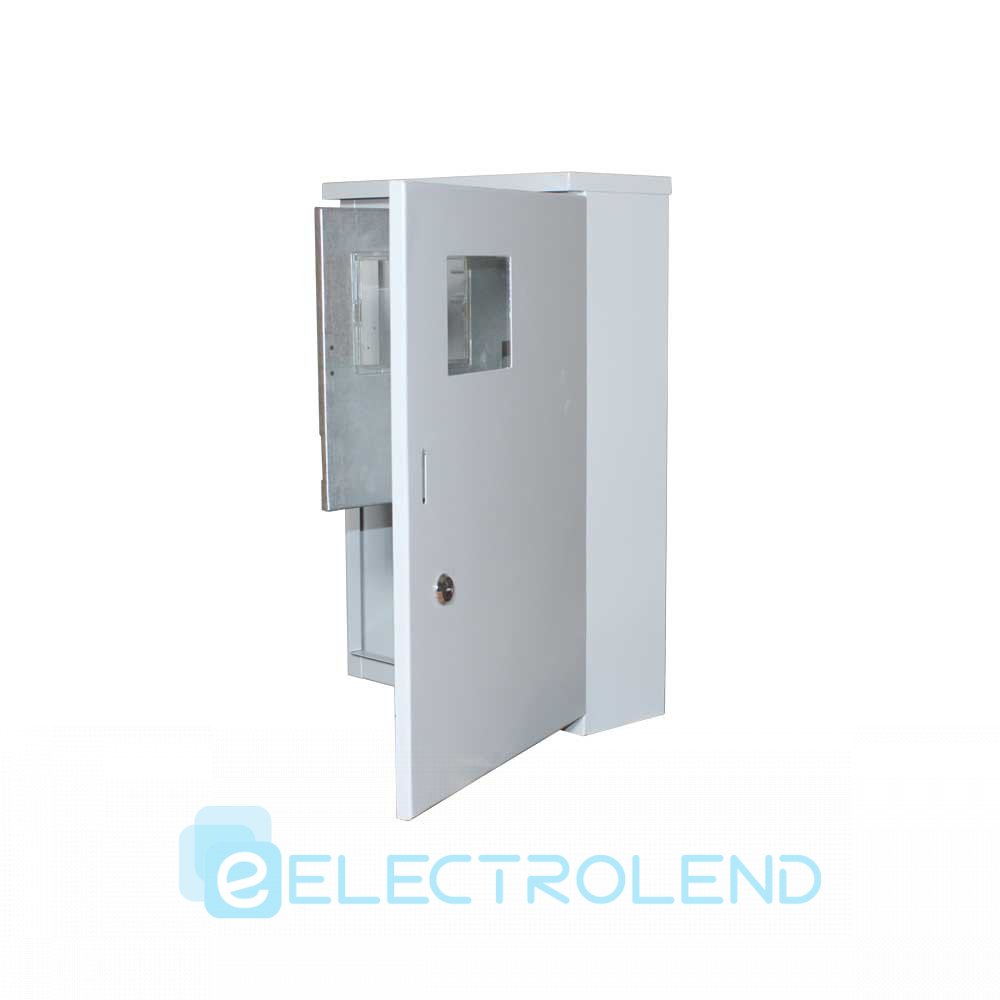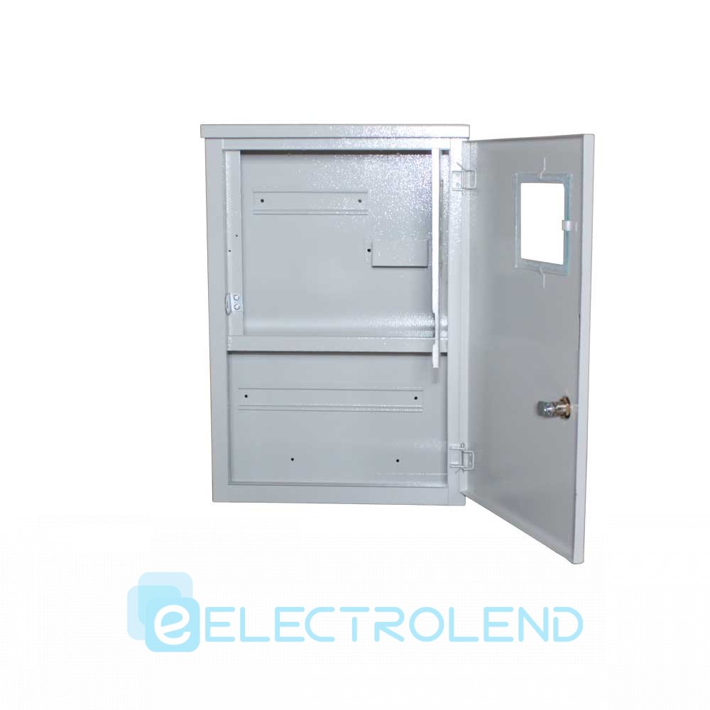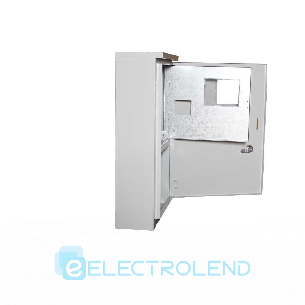 Двухдверный, под 1ф или 3ф счетчик, вводный 3-х полюсный автомат, автоматические выключатели до 12 групп, с окошком на наружной дверце для снятия показаний счетчика. На дне выполнено три отверстия диаметром 26 мм под сальник диаметром 25 мм.