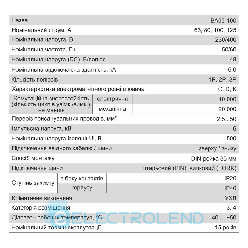 Автоматический выключатель ВА63-100, 63A, 6kA, 1P, х-ка K, Electro
