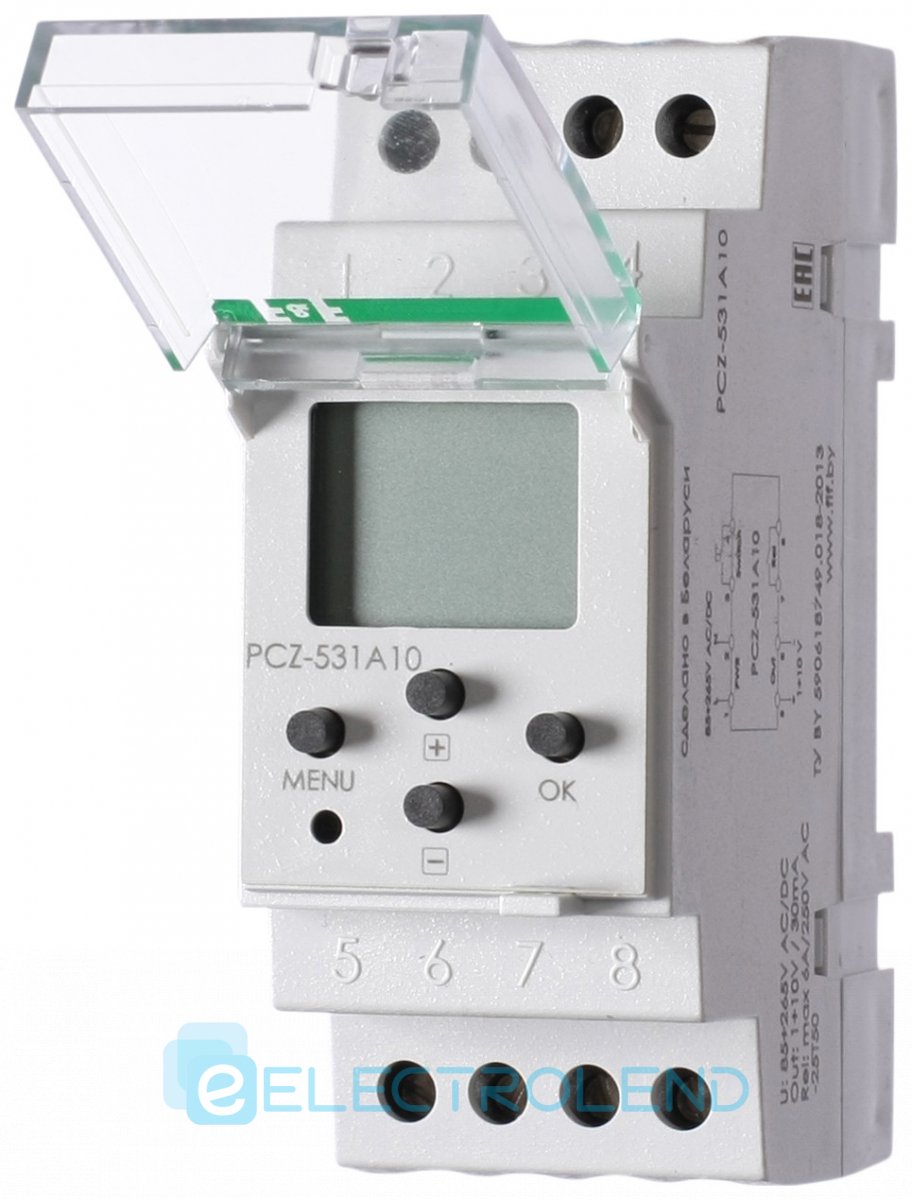 Реле PCZ-531A10 – программируемый регулятор яркости освещения с суточным или недельным циклом. Предназначено для программируемого управления яркостью освещения через устройства со стандартным диммируемым входом 0-10В.