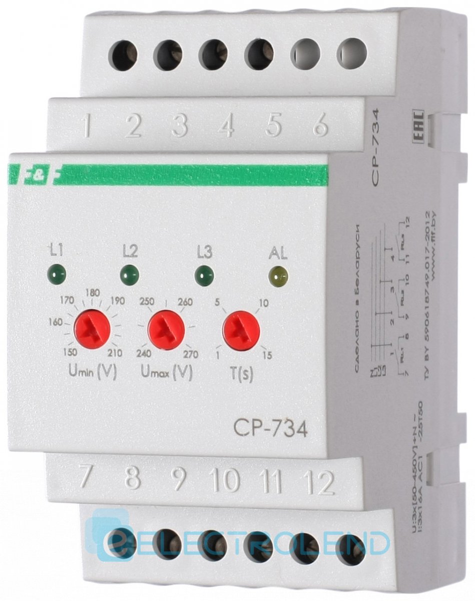 Нижний предел 150-210 В, Верхний предел 240-270 В, отдельный контакт на каждую фазу, контакт 3NO, 3х16 А.