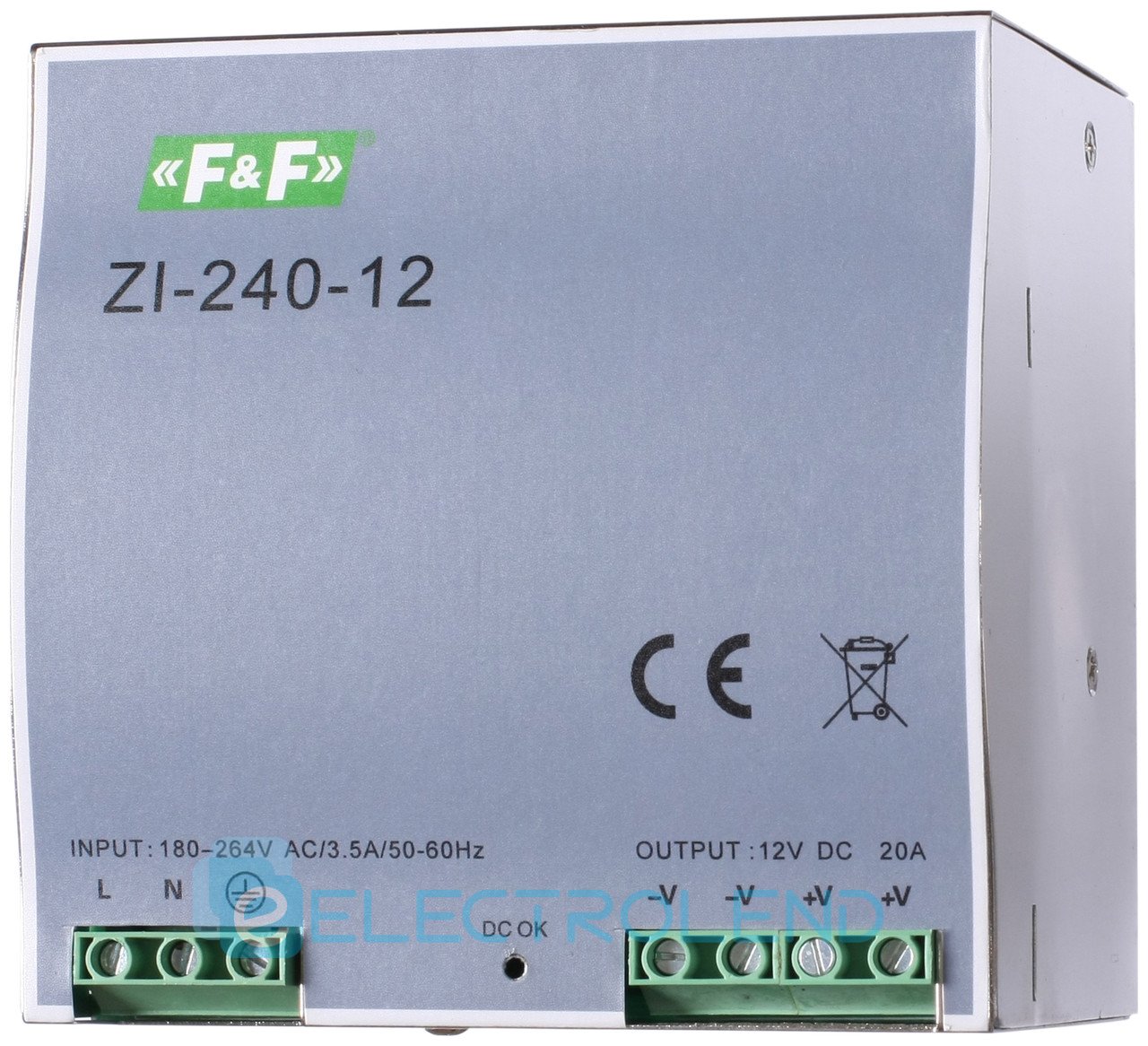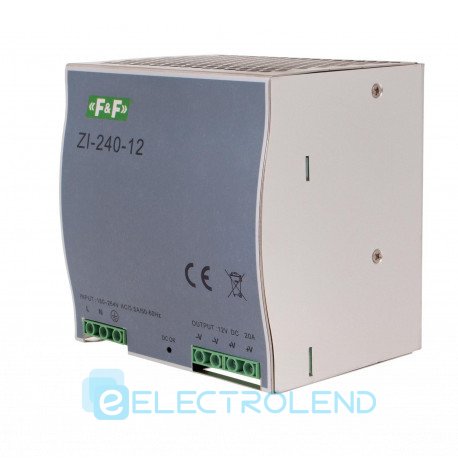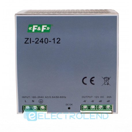 Импульсный. Входное напряжение 100-240В AC/120-370В DC. Выходное напряжение 12В DC. Выходная мощность 240Вт.
