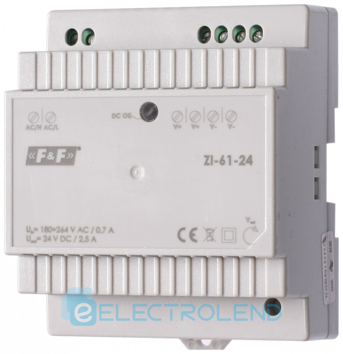 Импульсный. Входное напряжение 180-264В AC. Выходное напряжение 24В DC. Выходная мощность 60Вт.