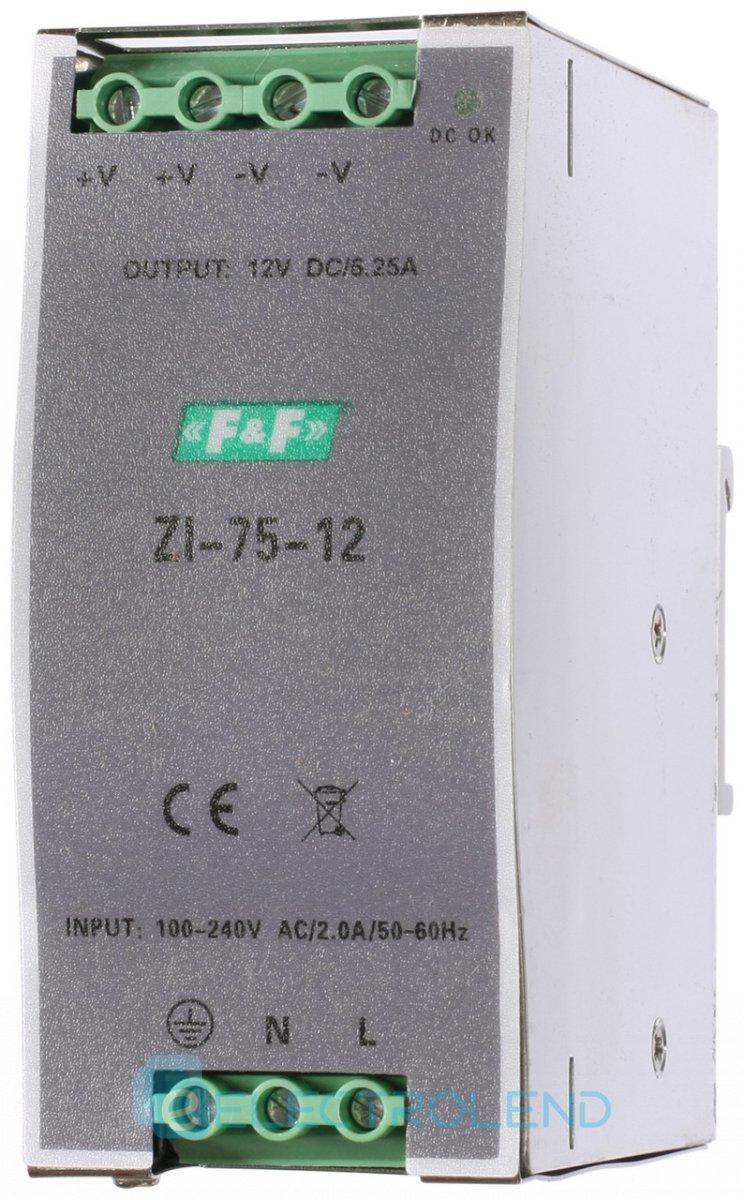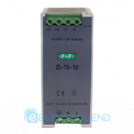 Импульсный. Входное напряжение 100-240В AC. Выходное напряжение 12В DC. Выходная мощность 75Вт.