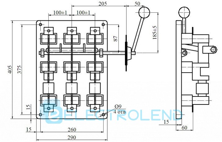 Рубильник РПБ-6 630А с боковой рукояткой, с олово, без предохранителей, медно-лужёные контакты