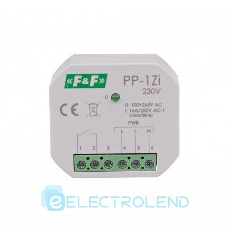 подачей напряжения питания на реле переключает контакты. Состояние переключения реле отображается зеленым светодиодом. После сбоя питания контакт возвращается в исходное положение.