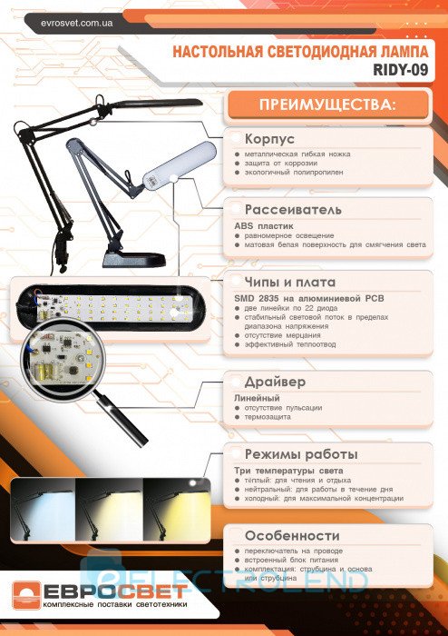 У настольной светодиодной лампы ЕВРОСВЕТ Ridy-09_SP 9Вт черной регулируется положение и цвет свечения от теплого к холодному в трех режимах. Если вы в поисках надежной и эстетичной настольной лампы, выбрав эту модель, точно не пожалеете.